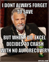 Since many large Excel files in the enterprise have tons of accounting, formulas, object tracking, and other data in them, many times you never really know how old the files is, what the original version of Excel it was generated in, whether it started life as a .xml standard file, etc. Start a new file, cut and paste each page into the new file, cleanup any unneeded data, and you should be good to go. That is if you can get the files to open and cut and paste out of it. If not, try copying it from the server to your machine locally, if it’s not there already. You can also give “Autorecover” a shot as my friend in the picture refers to. Autorecover is a built in function in the later versions of Office that saves a copy of your file every few minutes. Chances are you have seen a tab on the left of Excel stating “Autorecover has saved a version of this file”. Just find that version of the file and see if it will open.